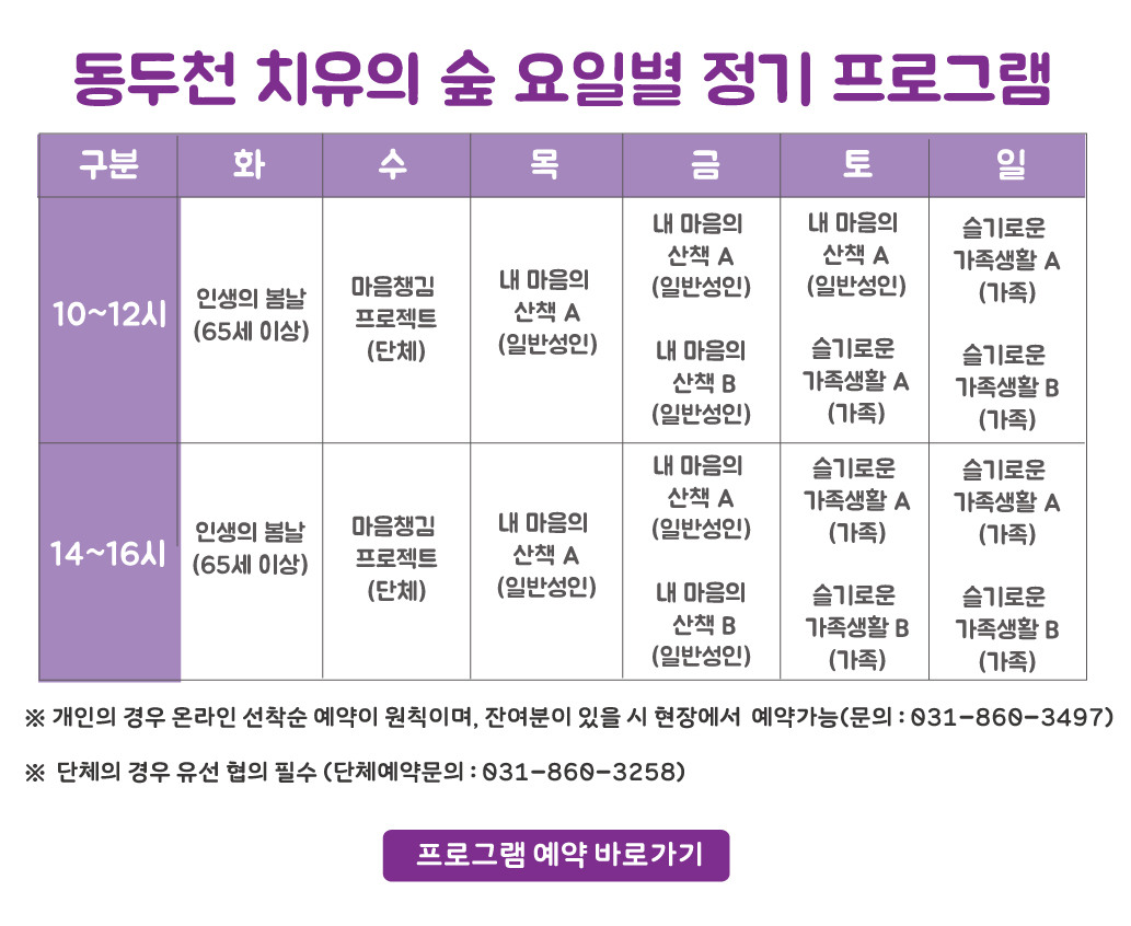 프로그램 예약은 '동두천 자연휴양림 홈페이지'를 통해 하실 수 있으며, <숲나들e> 아이디로 통합로그인 하실 수 있습니다.